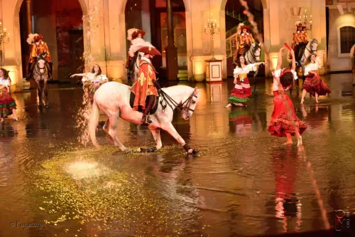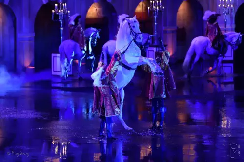 dresseur et ses chevaux dans le noir (éclairé par des tubes ultraviolets).