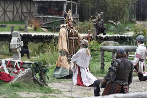 Dans le spectacle des Vikings, il nous apparaît Saint Philibert tenant sa crosse.