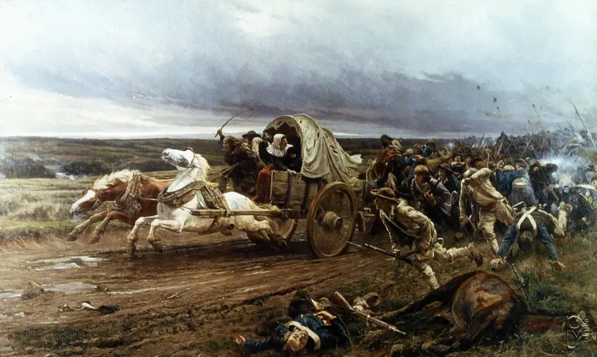 Au centre, une charrette dans laquelle ont pris place plusieurs Vendéens s'enfuit à vive allure vers la gauche du tableau.
