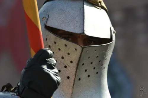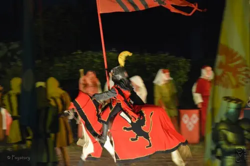 même couleur et le même blason que sur la robe, le fanion et le bouclier du chevalier.