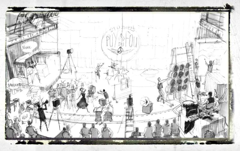Le Mime et l’Étoile est un spectacle grandiose du Puy du Fou, élu deux fois “Meilleur Spectacle du Monde” dès sa première saison Laissez-moi vous plonger dans cette histoire captivante. Dans le spectacle, Garance est mise en scène aux côtés de Mimoza, un jeune mime rêveur d’origine tzigane. Nous sommes en 1914, et les visiteurs sont invités dans un studio pour assister, en silence, au tournage d’un tout nouveau film mettant en scène deux personnages : Garance décrite comme une étoile montante du 7ème art au début du XXe siècle, et Mimoza, le jeune mime rêveur. Sur le plateau, le réalisateur Gérard Bideau espère réaliser son rêve. Il est convaincu que seul un amour sincère pourra offrir au cinéma muet et noir et blanc une couleur et un son. Devant la caméra du metteur en scène, Mimoza, malgré son statut de mime, puise dans ses rêves d’enfance mille tours et illusions pour impressionner Garance qui a déjà gagné son cœur. Mais le tournage prend une tournure dramatique et est soudainement interrompu par un événement dramatique qui bouleverse la vie du jeune Tzigane, mais bouscule aussi les sentiments naissants de Garance et anéantit tous les espoirs du réalisateur. C’est une histoire d’amour poignante et émouvante qui se déroule dans le contexte fascinant de la naissance du cinéma. Le spectacle est un hommage aux pionniers du cinéma, comme les frères Lumière, Méliès, Keaton, Chaplin, et une plongée au cœur de la Belle Époque Il célèbre l’insouciance de cette époque et rend hommage aux premiers réalisateurs, véritables explorateurs de l’âge d’or du cirque tzigane et des illusionnistes. Une parenthèse enchantée de notre Histoire suspendue dans l’éternité, comme un souvenir d’enfance. Le Mime et l’Étoile est une révolution scénographique. Il restitue en direct l’esthétique exacte d’un film d’époque en noir et blanc, sans filtres ni artifices entre l’œil du spectateur et la scène. Les décors, les accessoires mobiles, les centaines de costumes et les effets de scène créent une illusion saisissante. Pour embarquer le spectateur dans un travelling géant, comme celui d’une caméra de cinéma, le Puy du Fou réalise une nouvelle prouesse technique et artistique. Les façades des maisons et devantures de magasins d’une rue typique de la Belle Époque défilent en décor réel devant une tribune captivée, tandis que les 120 personnages de l’histoire évoluent sur un sol mobile, renforçant l’illusion d’un travelling de près de 2 kilomètres.