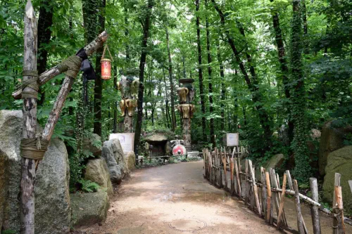 Une pierre tombale, un bouclier, une armure, deux totems décorés d'abeilles.
