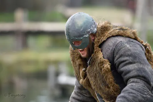 La tête est protégée par un bonnet de cuir bouilli.