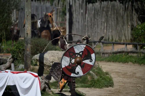 Un bouclier, un casque et une broigne permettent de se protéger.