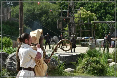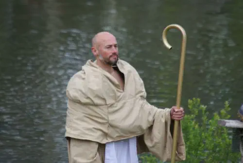 Dans le spectacle des Vikings, il nous apparaît Saint Philibert tenant sa crosse.