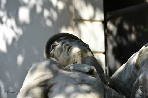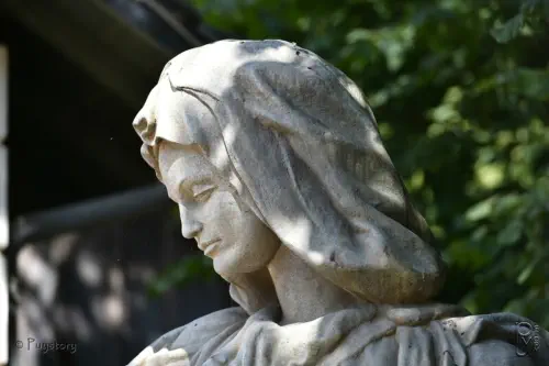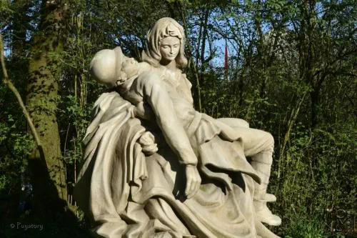 Une statue, inspirée de La Pietà de Michel-Ange, représentant une femme portant un