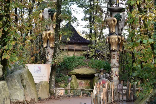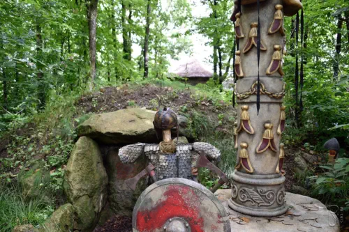 Une pierre tombale, un bouclier, une armure, deux totems décorés d'abeilles.