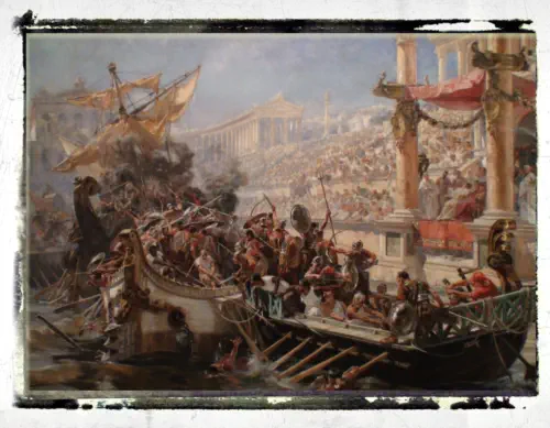 Avant César, on n’avait guère vu que de timides essais de naumachies données sur mer.