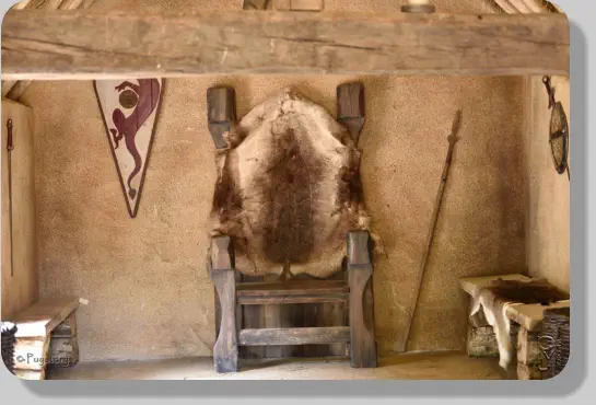 - Un fossé et une palissade protègent des bâtiments sur une levée de terre.